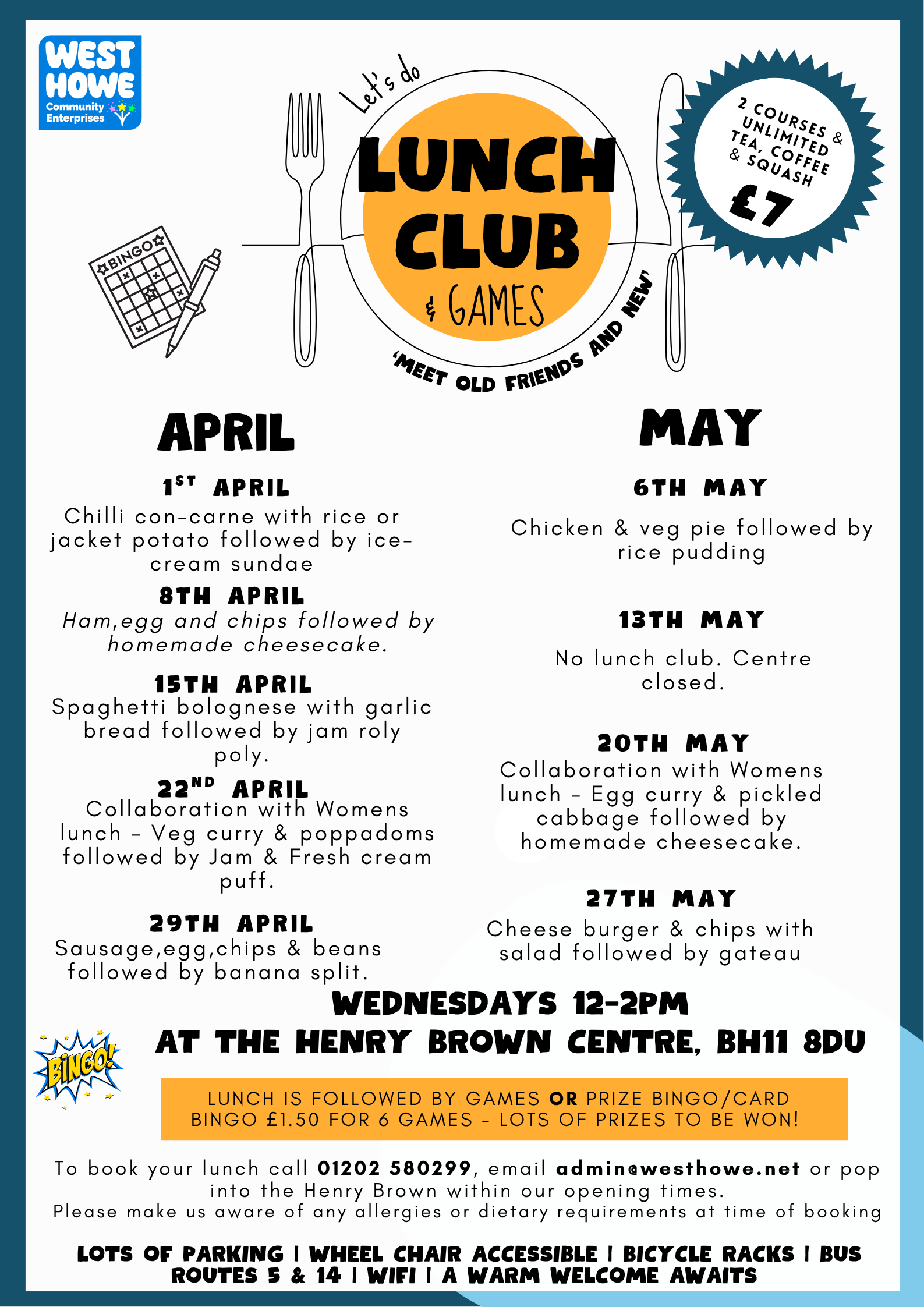 Join us most Wednesday's for our popular Lunch Club, hosted by our amazing Community Cook Nicola and our dedicated volunteers. Enjoy a warm welcome and a hearty, home-cooked two-course meal for just £7. Stick around afterwards for optional prize bingo at 1pm—£1.50 for six games.